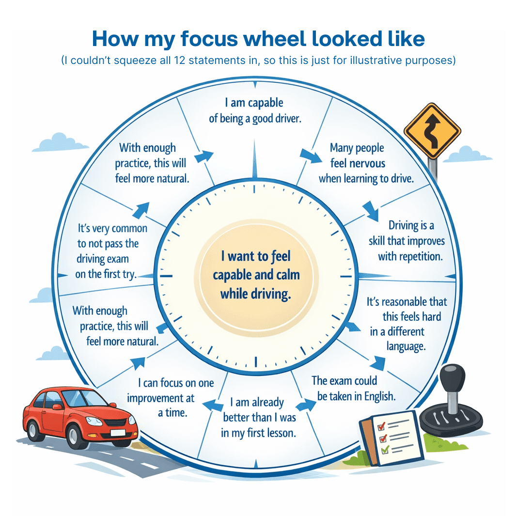 If I had written in the center, “I am an excellent driver,” it would have felt ridiculous. My body would have rejected it immediately.