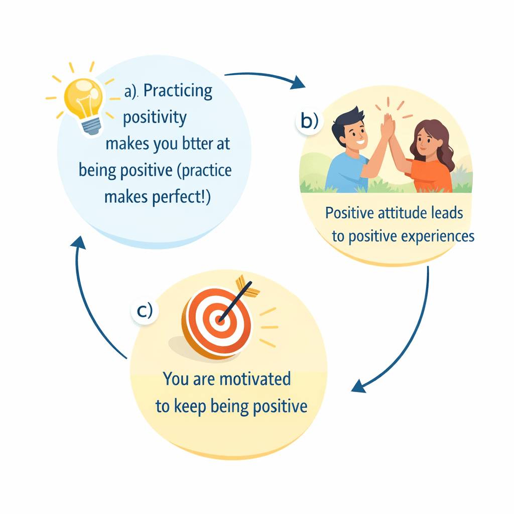 (a) Practicing positivity makes you better at being positive (practice makes perfect!) → (b) Positive attitude leads to positive experiences → (c) You are motivated to keep being positive → (a)